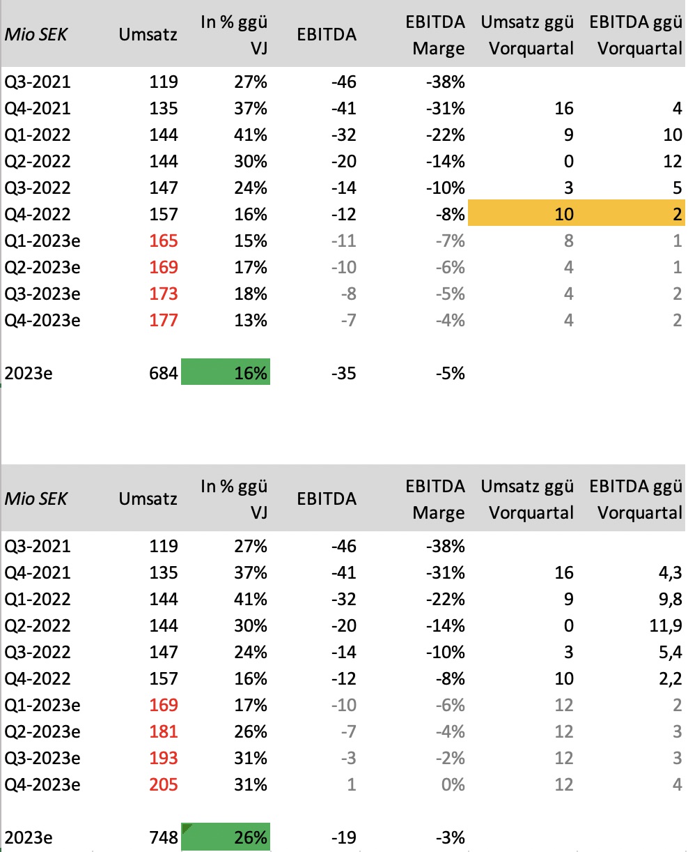 Und ich verstehe weiterhin nicht, warum ein 10 Mio SEK Umsatzanstieg, der doch eigentlich mit null zusätzlichen Kosten verbunden sein sollte (oder hängen die Ausgaben an die Verlage daran?), lediglich zu einem 2,2 Mio SEK zusätzlichen EBITDA Beitrag geführt hat, obwohl man in den Vorquartalen deutlich höhere EBITDA-Verbesserungen gesehen hat (siehe meine u.a. Mini-Tabelle, orange unterlegt). Gibt ja vllt eine plausible Erklärung dafür.