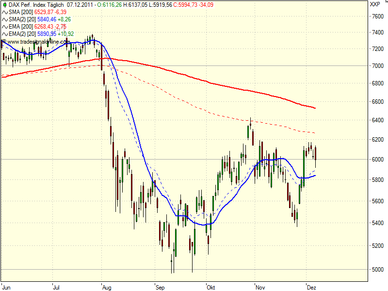 Hintendran ein Bild vom DAX der letzten 12 Jahre. Die dicke blaue Linie ist der Verlauf des 200 Tagedurchschnitts.