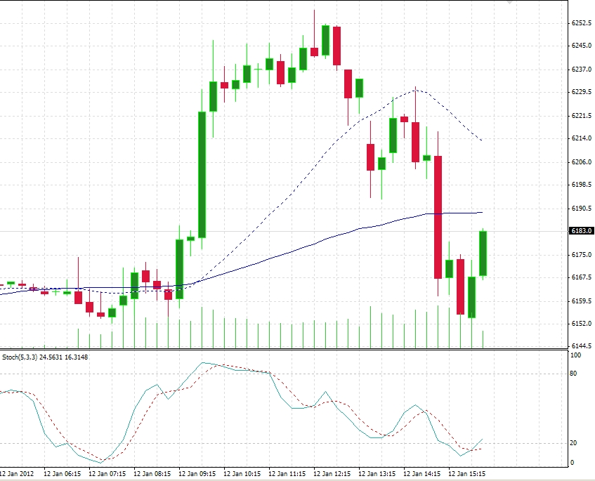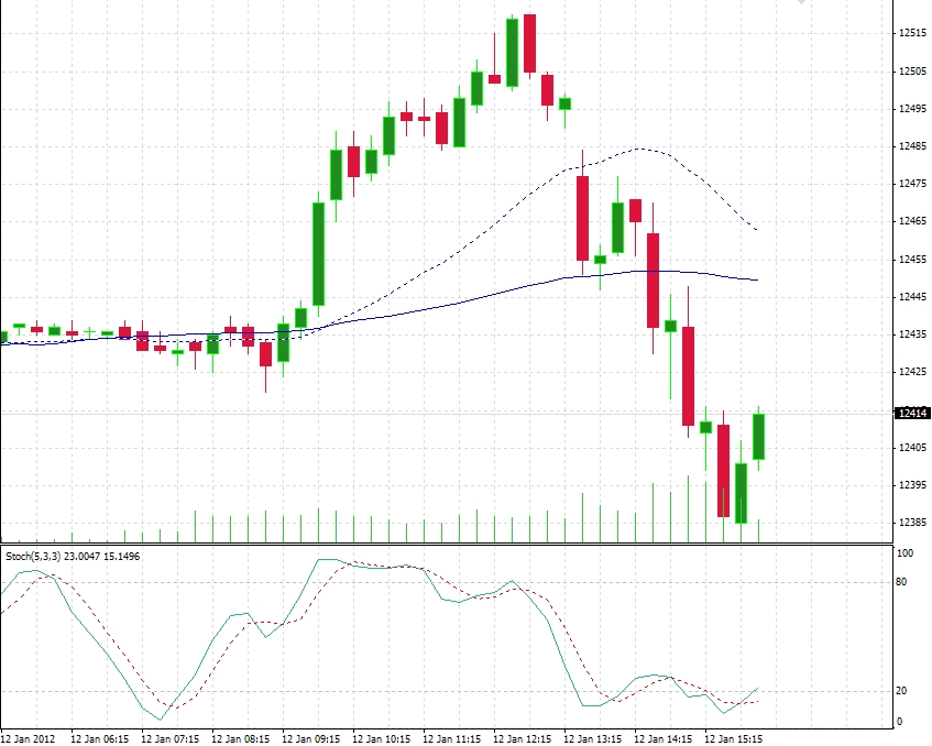Und so macht man das: Der DOW-Future wird nach oben getrieben und der automatisierte DAX-Handel zieht über den DAX - Future alles hinterher. Hier der DOW im gleichen Zeitraum, auch im 15 Min TF