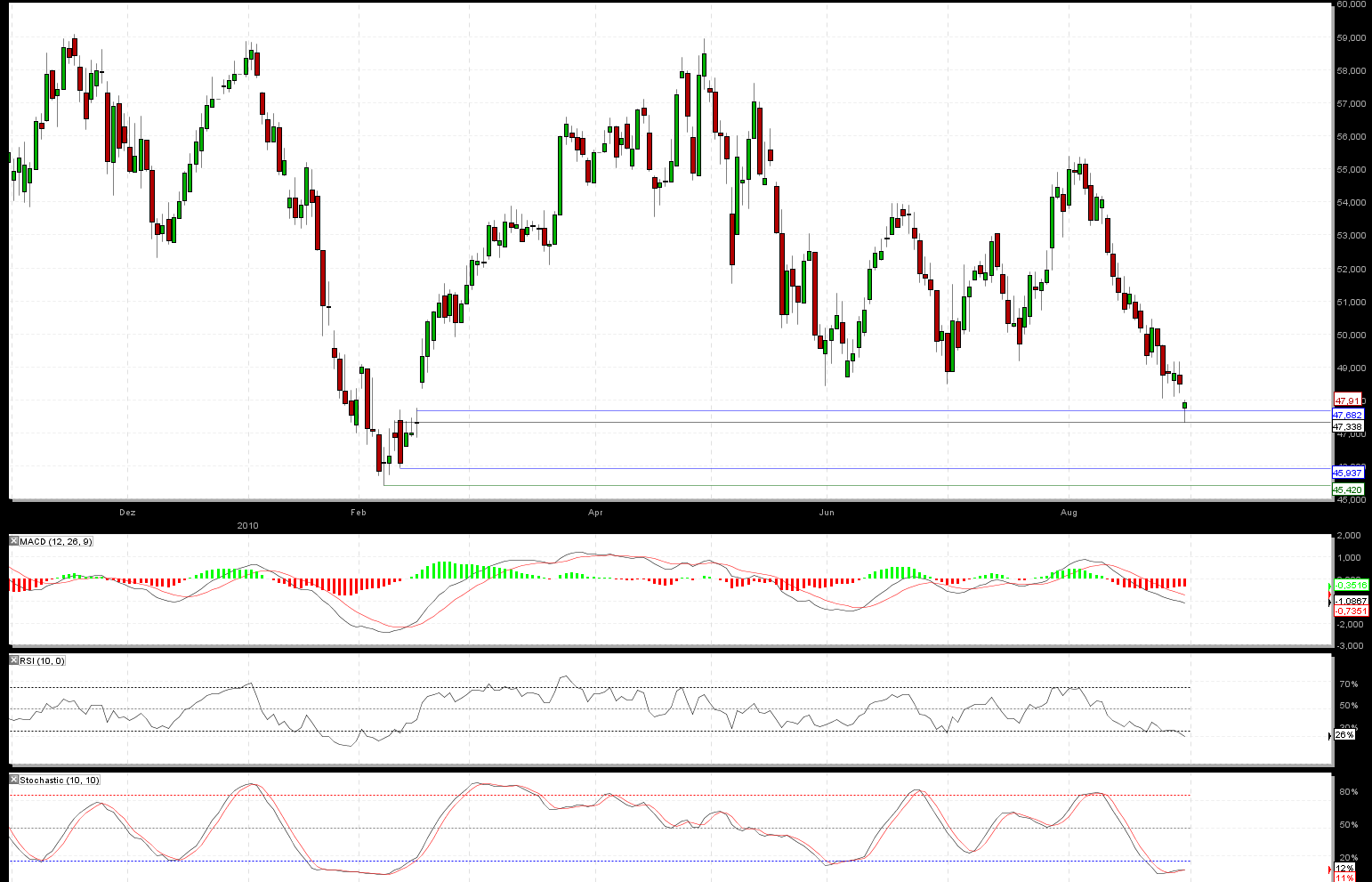die deutsche Börse hat soeben das Gap vom 17.02.2010. geschlossen. Ein einstig mit engem SL. sollte sich heute sehr profitabel sein. Auf 6 Wochen Sicht halte ich einen Anstieg auf 55 € für realistisch.