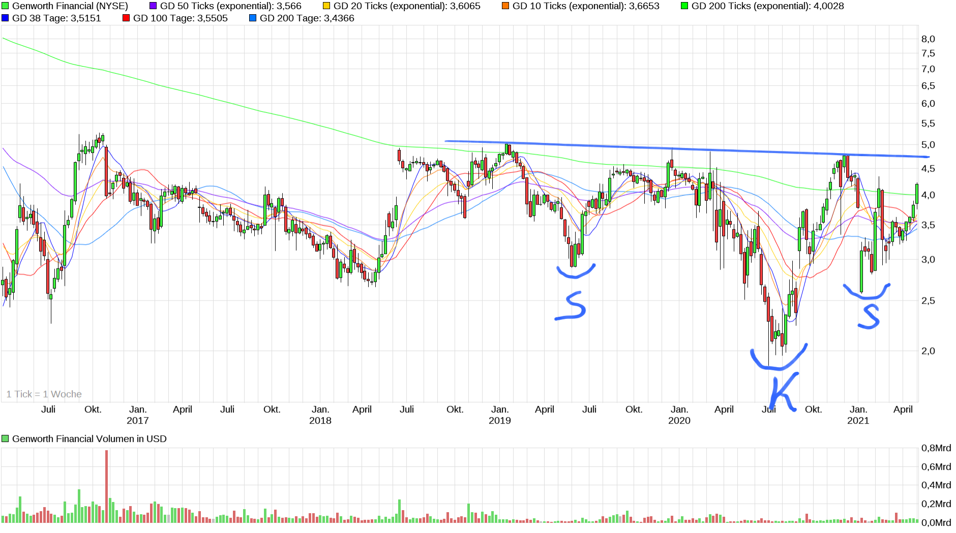 ... falls es die Genworth-Aktie im Laufe des Jahres mit dem IPO nachhaltig über circa 4,80 USD schafft. Und immerhin wurde jetzt schon mal wieder Zeit die 200T-Linie geknackt.
