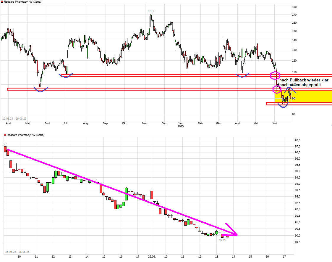 Die beiden Zahlen wohl besser erst einmal wieder umstellen. Die Aktie fällt seit Tagen wieder rapide und die 89 ist in Sichtweite. Man ist klar wieder an dem Widerstand (Tief Mai 2024) nach unten abgeprallt und bei der Abwärtsdynamik der letzten zwei Tage könnte bald wieder sogar das jüngste Jahrestief im 86er Bereich auf die Tagesordnung kommen. Von daher ist noch keine klare Bodenbildung bislang erkennbar.