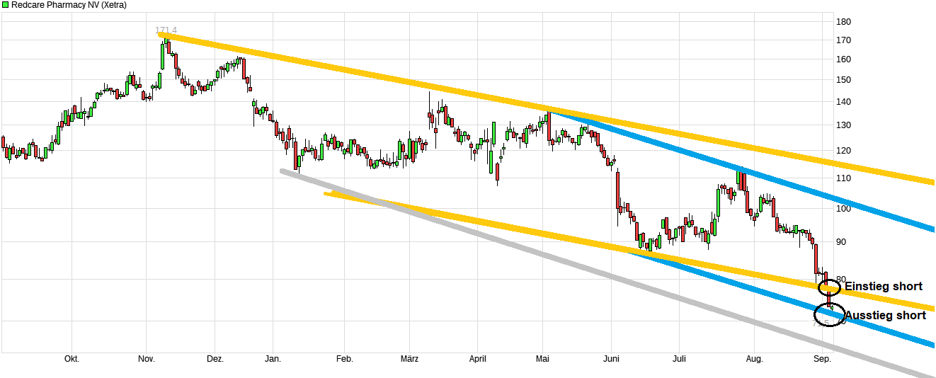 Also du hast natürlich völlig Recht, daß irgendwas aus ausgelöst werden könnte was den Kurs wieder steigen läßt. Meinen Short-Einstieg würde ich deswegen aber nicht als mutig bezeichnen, sondern für mich war das ein normaler spekulativer Einstieg nach einem Signal was ein gutes Chance-Risiko-Verhälnis lieferte. Natürlich gibt es auch da ein Risiko, daß es gegen einen laufen kann. Deswegen setze ich bei gehelbten Trades auch engere SL als bei ungehebelten Trades, zudem ziehe ich den SL dynamisch nach als Schutz. Und es wird auch nicht mit zu hohem Geldeinsatz "gespielt". Natürlich wird die Aktie nicht endlos so weiter fallen und man mußte sich daher durchaus überlegen, ob man da noch short gehen sollte, wenn es schon etwas länger davor tiefer ging. Aber ich habe das Verkaufsignal gesehen als man unter78 gefallen war (Break durch die gelbe untere Linie) und hatte daher als spekulatives nächstes Anlaufziel die untere blaue Linie gesehen. Das Ganze gespielt mit einem 5er Hebel, abgesichert mit SL und heute dann vorhin verkauft als es an die 72er Marke ging bzw. sehr nahe an der blauen Linie ankam. Das könnte natürlich auch noch tiefer gehen in der nächsten Zeit (z.B. bis zur unteren grauen Linie), aber für mich war eben der oben genannte Bereich mit gutem CRV versehen gewesen. Darunter würde ich das CRV wieder etwas weniger stark einschätzen. Ich warte jetzt ab, ob es in der nächsten Zeit Anzeichen gibt es kommt zu einer technischen Gegenreaktion mit entsprechenden Signalen. Bin wie gesagt flexibel. Wichtig ist lediglich ein CRV was gut erscheint bzw. starke Signale.