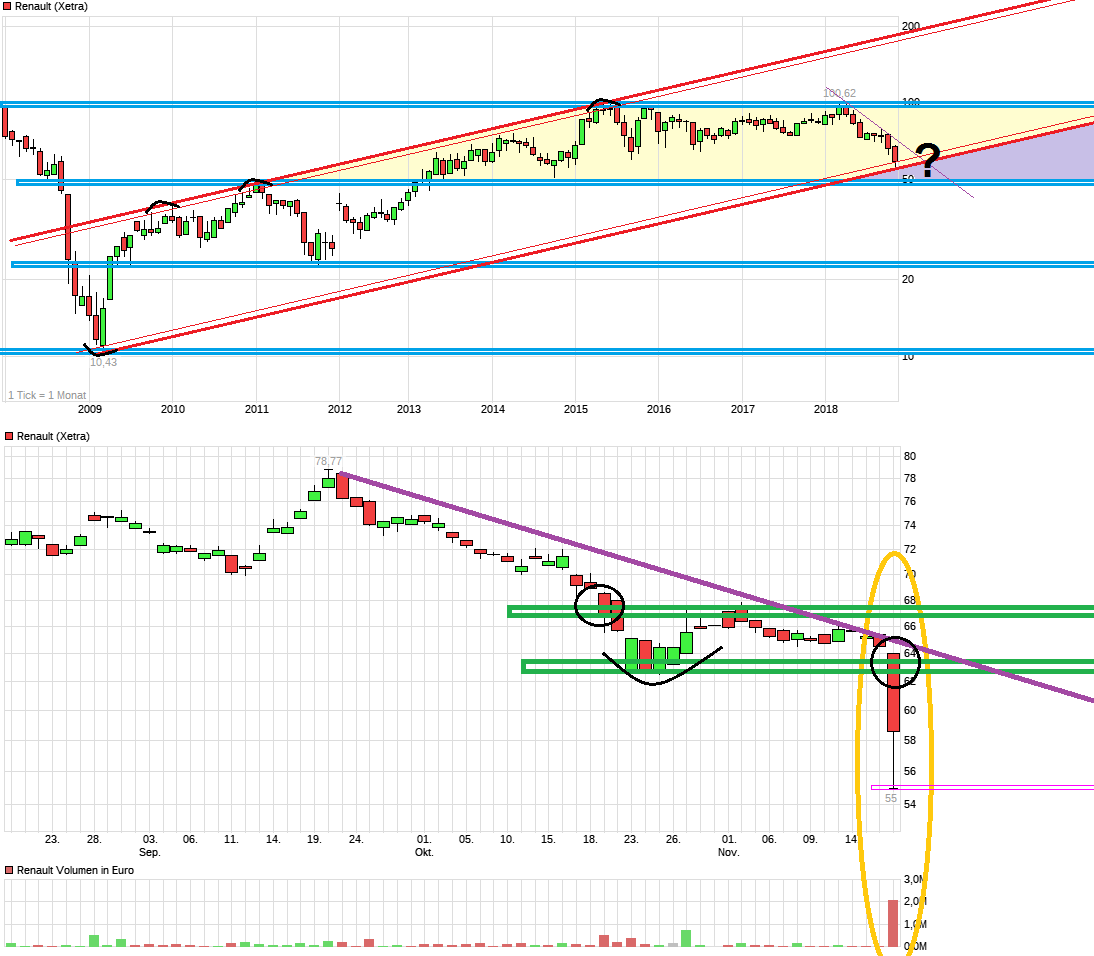 Man ist nur kurz davor ein neues Mehrjahrestief zu machen und neue Verkaussignale damit auszulösen. Fällt man unter die Unterstützungsregion um 69,90, dann könnte das nochmal einen direkten weiteren Ruck nach unten geben. Der große Abwärtstrend ist ja ohnehin seit langem völlig intakt und daher weiterhin keine Kaufsignale zu sehen. Wer seinem Depot richtig schaden wollte, der dürfte Chemie&Autowerte auf hohem Niveau gekauft haben und sich ab dann konsequent Augen und Ohren zugehalten haben anstatt zeitnah anschließend zu handeln und neue ökonomische Realitäten zu akzeptieren anstatt sich die Welt weiter schönzureden. Abkühlung der Weltwirtschaftt ist ja Fakt (wurde gestern nochmal bestätigt) , die Zinsen ziehen recht zügig an (T-Bonds schon deutlich über 3%) und der Handelskrieg der USA mit China und Europa wird sicher die Autobranche mit am stärksten treffen. Wie man in z.B. 2014 sehen konnte, kann die Renault-Aktie in schwachen Börsenzeiten mit schwachen Unternehmenszahlen problemlos zügig Richtung 50€ zurückfallen. Daher ist die mögliche Fallhöhe bei einem Kurs von z.Z. um die 70 € eben noch immer nicht gering. Somit scheint hier erstmal weiterhin große Vorsicht geboten solange das Weiße Haus in der Hand eines Dilettanten ist, dem die nachhaltigen ökonomischen Auswirkungen seinen Irrsinns nicht bewußt sind, die am Ende auch negativ auf die USA zurückschwappen werden. Sichere Häfen sind momentan ganz anderswo zu suchen. Viele blauäugige Anleger lassen sich immer wieder zu leicht vom günstigen KGV der Vergangenheit einlullen und wollen nicht erkennen wie klare Änderungen im markoökonomischen Umfeld die Zukunft von Branchen aus konjunktursensiblen und zyklischen Branchen auch wieder schnell anderes aussehen läßt, wie z.B. bei Autobauern. Kennt man ja schon von anderes Spätphasen einer spätreifen Hausse wie Ende der 90er Jahre oder 2007. Muß natürlich jetzt nicht so dramatische Züge wie damals annehmen, wenn nicht wieder irgendwo ein schwarzen Schwan hinzukommt. Aber es kann eben durchaus erstmal eine längere Durststrecke wieder geben für europäische Autobauer. Man kann nur hoffen, daß irgendeiner mal dem Trunp die Pillen wegnimmt die notorischen Wahnsinn auslösen. Ansonsten muß man eben warten und hoffen, daß die Amtszeit von Trump auf 4 Jahre beschränkt bleibt.