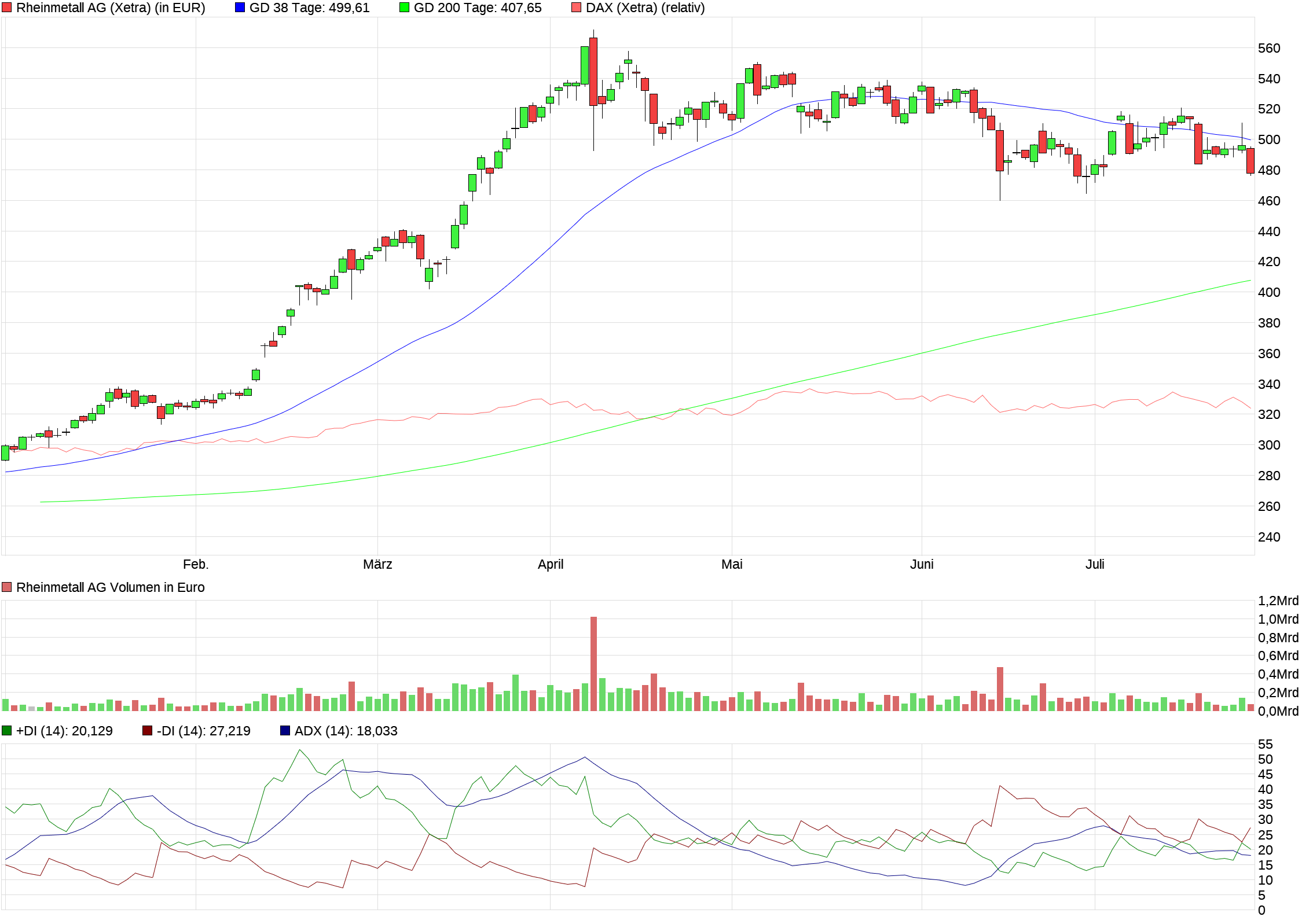 Der Kurs befindet sich in einem mehrmonatigen Abwärtstrend, den man als Konsolidierungsflagge seit dem Hoch vom April deuten kann. Ein steiler Einbruch schien eine Zeitlang möglich, ist aber ausdrücklich vermieden worden, vor allem Mitte Juni. Der Verlauf ist in letzter Zeit schwach, das ja, und es gibt immer wieder große rote Kerzen. Dabei ist aber alles in demselben Kanal geblieben, und das Volumen hat sich sichtlich vermindert.