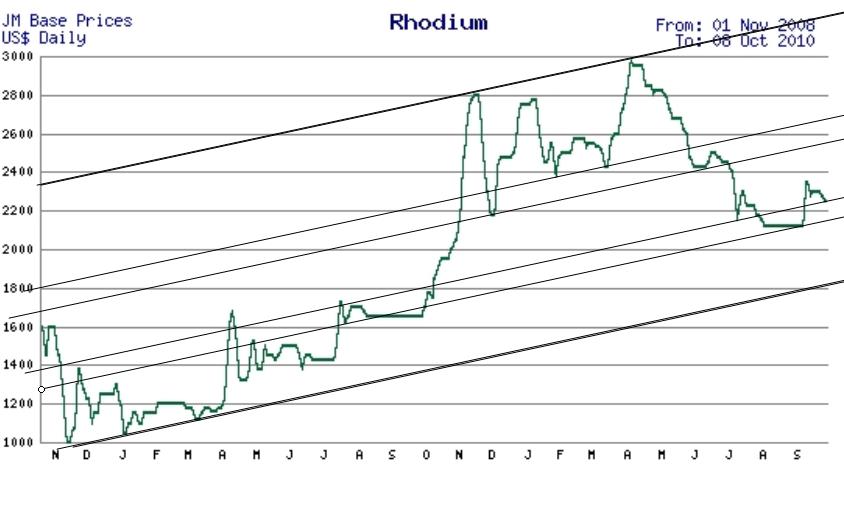 Noch im vergangenen Jahr (2008) hatten Marktbeobachter damit gerechnet, dass sich der Rhodium-Preis bei etwa 10 000 Dollar je Unze stabilisieren könne, weil die verschärften Abgasbestimmungen in vielen Teilen der Welt die Nachfrage nahezu garantierten. Mittlerweile halten Analysten eine baldige Rückkehr zu diesem Rekordpreis aber für unwahrscheinlich. Selbst die Marke von 2000 Dollar werde vermutlich nicht so bald übersprungen werden. "Angesichts der noch nicht ausgestandenen Krise in der Autoindustrie scheint der jüngste Preisauftrieb nicht gerechtfertigt. Daher erwarten wir in der nahen Zukunft keinen Preis von 2000 Dollar und mehr", schreibt Heraeus. Die Bank Standard Chartered prognostizierte noch im Februar (2009) einen Anstieg des Rhodium-Preises in der zweiten Jahreshälfte (2009) auf durchschnittlich 1500 Dollar je Feinunze und im kommenden Jahr (2009) auf 2500 Dollar je Unze.