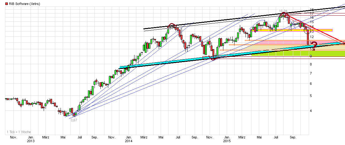 Also da lehnt man sich wohl nicht zu weit aus dem Fenster, wenn man da den Verdacht haben könnte, daß da mal wieder ein Nettoleerverkäufer seine frisch ausgeliehenen RIB-Aktie gezielt in dem Bereich massiv verworfen hat, um eben diese Chartreaktion auszulösen.(Blackrock?). Habe ähnliche Dinge schon öfters in ähnlicher Form erlebt mit diesen Herrschaften. Sieht jetzt natürlich kurzfristig etwas aus wie eine SKS. Muß sich aber die nächste Zeit zeigen wie nachhaltig die Nackenlinie nun durchbrochen wurde. Pullback an diese Nackenlinie wäre jedenfalls erstes Anlaufziel bei einer technischen Gegenreakion sobald man einen (temporären) Boden wieder gefunden hat. Auch muß sich zeigen, ob der seit Mitte 2014 leicht steigende Aufw.trendkanal verteidigt wird. Da länge die Unterkante momentan im Bereich um die 11,20/30. Gleichzeitig gibt es ja noch den seit seit August fallenden Abw.trendkanal, bei dem ebenfalls die Unterkante im Bereich um die 11,20/30 liegen würde. Wäre also denkbar, daß man bis zu den Zahlen oder mit den Zahlen dahin noch weiterfällt, dann aber nach oben wieder abprallt (falls nicht Blackrock & Co. da versuchen werden auch noch diese Unterstützungen zu unterbieten). Sehe das Ganze erstmal unaufgeregt, da ich bekanntlich bei knapp unter 14€ meine Longposition abgesichert habe mit Shorts, weil mir bestimmte Muster und Reaktionen im Chartverlauf sowie bei Indikatoren schon zunehmend unschön vorkamen und ich erstmal die Zahlen lieber abwarten wollte bis ich neu entscheide wie ich hier mir dem Wert weiter verfahren werden. Sollte man mit den Zahlen keine wirklich unerwarteten Enttäuschungen abliefern, d.h. nichts verkünden was unter der bisherigen Prognosespanne läge, und der Markt sich nur daran stören würde, daß noch keine PIII bislang eingefahren wurden bzw. sich die beiden angedachten PIII möglicherweise verschieben auf Anfang 2016, dann wäre der Bereich im untern 11,xx Bereich durchaus als Einstieg wieder interessant. Könnte dann Anfang 2016 vielleicht kurssteigernde News geben, wenn diese PIII dann doch noch verzögert kämen. Schauen wir also mal was am 30.10. vermeldet wird und wie man darauf reagieren wird..