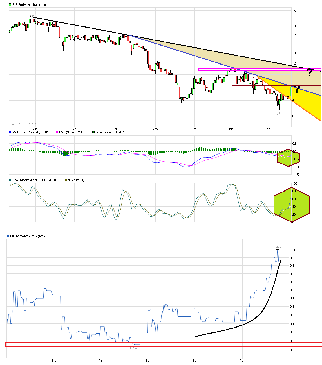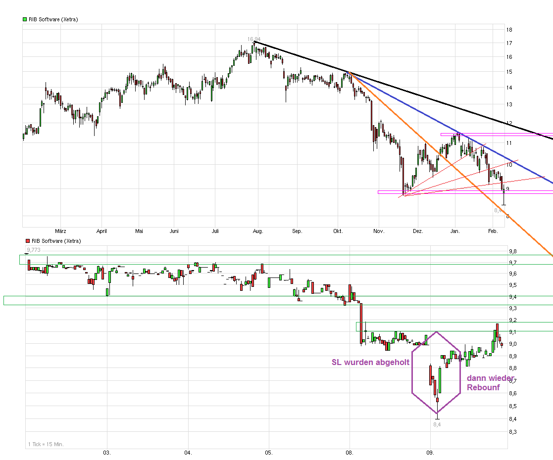 Gold Long hatte ich jüngst auch mehrfach getradet (siehe Gold Tradingthread). War relativ gut erkennbar, daß dort das Pendel nach langer Zeit nach oben ausschlägt. Aber trotzdem werde ich hier keine anderswo gemachten Gewinne riskieren und bei RIB jetzt auf dem Level Short gehen ohne charttechnisch neue klar Shortsignale oder Unternehmensmeldungen die zeigen, daß die 2016er Erwartungen nicht mehr erreichbar sind. Auch wenn die Gefahr besteht nach unten durchzubrechen, noch fehlt dieses Signal. Wir haben Anfang Februar und das Jahr ist noch lang. Wenn man bis Ende März weiterhin deutlich unter dem Soll liegen sollte bei neuen PII/PIII, dann wäre die Sache vielleicht schon etwas klarer. Ende März ist auch die PK nach den entgültigen Gesamtjahreszahlen. Momentan ist so ziemlich alles im Kern gesamtmarktgetrieben, auch der jüngste Rückgang bei RIB. Von daher sind erstmal Trades auf den Index noch interessanter, da dies dominant ist. Allerdings wäre ich auch vorsichtig mit neuen Long-Einstiegen bei RIB solange nicht klarer wird wie das Jahr weiter verläuft. Euro/Dollar Entwicklung ist sicher ein Faktor der nicht ganz unwichtig ist. Momentan läuft man beim Euro wieder in Regionen in denen man schon Anfang August. Sollte Draghi im März mehr liefern als im Dezember, dann könnte der Euro wieder durch weiter QE Maßnahmen auch wieder geschwächt werden. Würde erstmal erwarten, daß Euro/Dollar nicht so schnell über 1,17/1,20 rauskommt, aber auch nicht mehr so schnell unter 1,04/05 läuft .