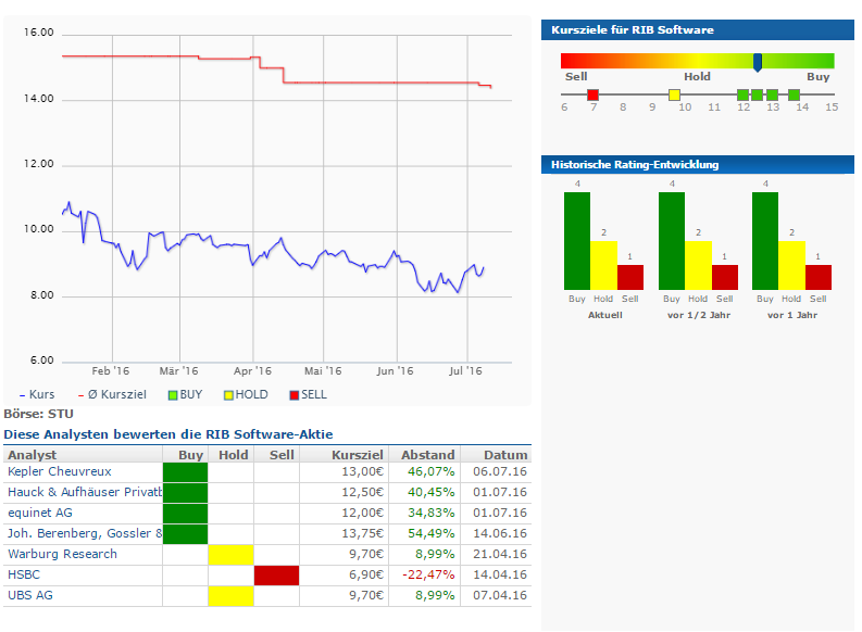 Um die aktuelle Steilvorlage nicht zu gefährden, sollte die RIB Software-Aktie nicht mehr unter die oben genannte Marke von 8,74 EUR zurückfallen, so die Analysten von HSBC Trinkaus & Burkhardt. (Analyse vom 22.07.2016)