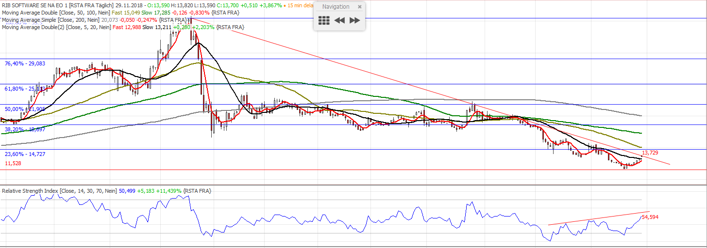 RIB Software heute an der Abwärtstrendlinie ausgehend vom Hoch Mitte/Ende März 2018 angekommen. Außerdem hat sich seit Anfang Oktober eine bullishe Divergenz zwischen Kurs und RSI gebildet. Sowohl MACD und Momentum haben diese Woche zudem ein Kaufsignal gegeben (was allerdings nicht überbewerttet werden sollte).