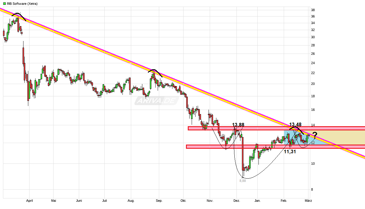Erstmal einen Schritt nach dem anderen Schritt nachhaltig schaffen. Tempo wäre mir jetzt nicht ganz so wichtig wie erstmal überhaupt die Richtung nordwärts beizubehalten. Momentan kämpft man damit den seit einem Jahr fallenden Abw.trend zu überwinden ( was natürlich über die Zeit immer leichter wird, da es eben eine stetig fallende Linie ist, wo täglich das Stöckchen immer niedriger wurde über welches man springen müßte). Und falls man diese Trendlinie überwindet ( und vielleicht danach nochmal einen Pullback daran macht), dann steht schon wieder die nächste harte Hürde vor der Tür mit der horizontalen Region 13,48/88. Quasi der Kursstand wo man Ende November stand, als fast alle Marktteilnehmer damit gerechnet hatten Trump und China einigen sich dort beim G8 Gipfel schon beim Thema Handelskrieg. Gelang bekanntlich nicht, Märkte stürzten danach sofort ab, Xmas-Rallye fiel deswegen ins Wasser und seit Jahresanfang glaubt man doch wieder an eine Einigung, da fleißig von Trump getwittert wird man macht gute Fortschritte (und wohl beide Seiten erkannt haben, daß keine Einigung beide Länder unter Druck bringt). Jetzt ist also wieder die Frage, ob man den Vertrag mit China in den kommenden Wochen wirklich in trockene Tücher bringt oder nicht. Märkte preisen ersteren Fall wohl zu 99% aktuell wieder ein, wenn man die steile Bewegung seit Ende Dezember sieht. Geht es schief, dann steht man auch schnell wieder da wo man im Dezember im Low war. Entsprechendes wäre auch für den RIB-Kurs zu erwarten. Somit gibt es momentan auch noch ein nicht unerhebliches politisches Risiko hier, was dazu führen könnte, daß die Märkte nach dem Run jetzt eher erstmal zäh in eine Warteschleife gehen bis hier mehr Klarheit herrscht. Ob man da also "schnell" durchkommen würde durch die 13,88 oder sogar durch die von dir erhofften 15+x wird zum einen stark davon abhängen wie die Politik in die Gänge kommt und /oder RIB mehr "good news" nachlegen kann. Sollte es gelingen die Region um die 13,88 nachhaltig zu überwinden, dann könnte man vielleicht davon sprechen in den letzten Monaten eine große inverse SKS ausgebildet zu haben. Wäre natürlich eine schöne Bodenformation. Aber ist eben noch aktuell ein ungelegtes Ei. Von daher erstmal schauen wie man jetzt überhaupt den ersten Schritt zur Besserung wirklich schafft bevor man sich schon über den möglichen zweiten oder dritten Schritt zu früh freut. Schauen wir also mal was weiter wirklich passiert.