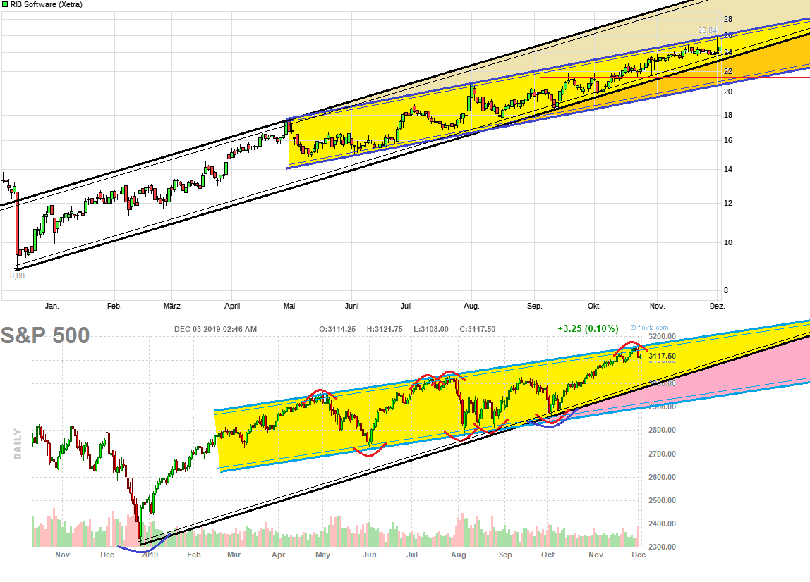 Man ist bei RIB im Hj1.19 zunächst sehr dynamisch im schwarzen Trendkanal angestiegen. Je weiter man aber diese ehemalige Unterbewertung abgebaut hatte, desto mehr hat man sich dann nurnoch in der unteren Hälfte dieses schwarzen Kanals weiterbewegt, weil die Kraft fehlte wieder bis zur Oberseite zu Pendeln. Dabei hat sich oben eine flacher steigende blaue Begrenzungslinie ausgebildet. Es könnte also z.B. im Zuge einen möglichen Gesamtmarktschwäche passieren (wenn Trump/Xi weiter zu lange zaudern) , daß man den zu schnell steigenden schwarzen Kanal dann nach unten verlassen könnte , um dann im blauen Kanal mit etwas weniger Schaum vor dem Mund weiter nach oben zu pendeln. Ist halt auch nur ein mögliches Gedankenspiel von mir und soll nur zeigen, daß selbst ein Break des schwarzen Aufw.trends nicht das Ende der seit Anfang 2019 laufenden Aufstiegsbewegung sofort sein müßte. Gute horizontale Unterstützung gäbe es auch schon wieder im Bereich um die 22€. Wäre also z.B. denkbar, daß man vielleicht in Richtung Unterseite des blauen Kanals laufen könnte und dabei dann die Region um 22€ schon nicht mehr signifikant unterschritten würde. Setzt natürlich voraus RIB selber bringt keine Bad News und auch der Gesamtmarkt würde höchstens in moderaten Zügen durchatmen.