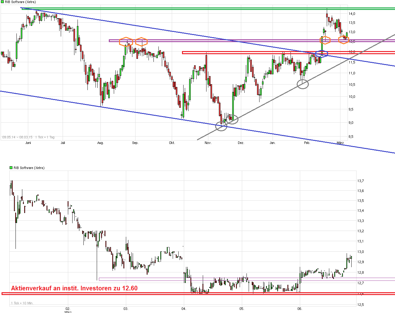 nur muss man eines ganz klar differenzieren. was mit rib seit nun gut 2wochen passiert, hat rein gar nix mit einer "normalen" wertentwicklung einer aktie zu tun. das es zu gewinnmitnahmen kommt, zu korrekturen, oder dergleichen, ist absolut normal und ein muss. aber das trifft beides nicht auf rib zu. die aktie geriet einfacjh ins visier amerikanischer hedgefonds. es ist ein technologiewert, der stark performte....und leider wurde eben er ausgewählt (neben aixtron, denen geht es noch schlechter mit leerverkäufen von 7,5%). auf rib sind leerverkäufe gesetzt von über 5% des volumens. das ist für unsere derzeitige marktsituation absolut unnormal. aixtron und rib sind die einzigen beiden deutschen aktien aus dax und tecdax, die derzeit bei über 5% liegen. der rest liegt irgendwo um die 2% im schnitt. für den kursrutsch von rib sind weder schlechte geschäftaussichten verantwortlich, noch eine notwendige korrektur oder eine unberechtigte rallye! kgv von 28(e) für 2015 ist für technologieunternehmen absolut normal und liegt im schnitt vom tecdax. der aktie fehlen derzeit gute nachrichten um den shorties die stirn zu bieten. diese werden bei aktueller marktlage aber ende märz kommen! kurzum: eure einschätzung auf tiefere kurse (test von 10,50€) halte ich durchaus für möglich. jedoch sind eure einschätzung über das "warum" schlicht weg falsch. die börse ist kein 1x1 und nicht immer logisch. rib ist im fadenkreuz von hedgefonds auf der shortseite geraten und daruas kann man sich bei einer so geringen marktkapitalisierung wie im tecdax üblich nur schwer befreien. es hätte nahezu jedes andere unternehmen im tecdax ähnlich treffen können, da sich rib in keinster weise fundamental zu den großteil der anderen unternehmen unterscheidet. zumindest nicht annähernd so weit, das alle dick im grünen sind seit 2wo und rib als einzigen neben aixtran im roten. scheiß hedgefonds....aber so ist das spiel. fakt ist...läuft der markt morgen und übermorgen weiter positiv, gehen die ersten shorties baden. und wenn nicht...bei 10,50€ dreht es spätestens.