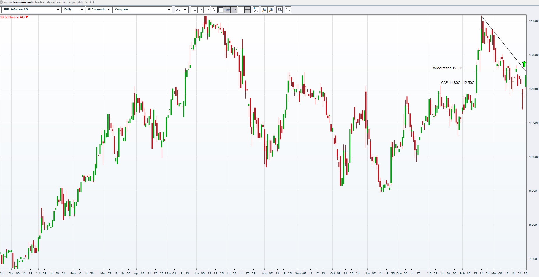 seit Ende Februar befinden wir uns in einem mittelfristigen Abwärtstrendkanal, den wir jetzt (Intraday) im Bereich von 12,50€ nach oben durchbrochen haben. Genau in dieser Zone verläuft auch ein starker horizontaler Widerstand aus den Septemberhochs des letzten Jahres. Charttechnisch von enormer Bedeutung ist, dass wir heute klar über 12,50€ schließen. Dadurch wäre der Abwärtstrend gebrochen, der hor. Widerstand überwunden und es würden somit kurzfristig neue Kaufsignale generiert! (Siehe Bild in großansicht!)