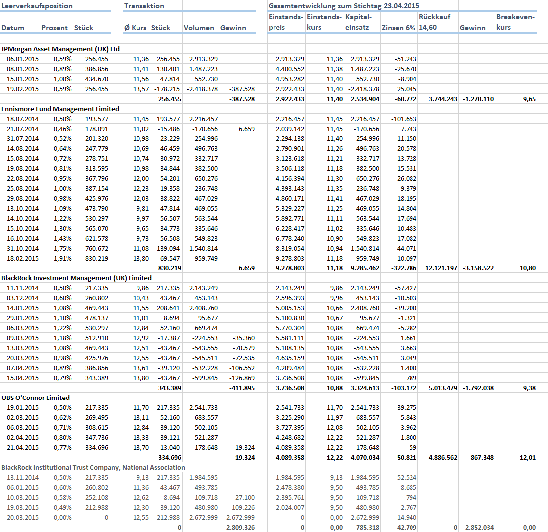 Der Weg nach oben scheint kurzfristig bis knapp über 15€ ohne weitere Widerstände frei....Die 14,30€, die bis jetzt ein Widerstand nach oben war, bildet nun natürlich kurzfristig eine gute Untestützung....ich bin echt gespannt was hier nach Q1 passiert. Also auf dem Level von jetzt (ca. 14,50€) werden wir meiner Meinung nach unmöglich bleiben. Entweder wird Q1 super, dann wird der markt reagieren, die Shorties werden weiter langsam reduzieren....dann heißt es wohl recht schnell 16 + XX ....oder wir enttäuschen (was ich nicht hoffe/glaube), dann wäre das Allzeithoch unmöglich zu halten, die Shorties würden versuchen durch höheren Druck ihre derzeitigen Verluste in Gewinne zu drehen (durch Erhöhung ihrer Positionen) ...dann gänge es aber mit dem Sommerloch ganz schnell Richtung 12€ - XX. Also ich denke es gibt nur diese beiden Varianten...auf dem Level von heute stehen wir in einem Monat nicht mehr. Ich sehe die Chancen bei ca. 70:30 für die variante, dass wir klar höher stehen im Mai...daher bin ich ja auch hier investiert...und nicht woanders^^
