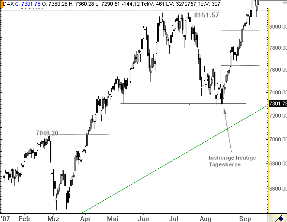Und was kam raus? genau, Dax bei 7300 bisher!!! Da die zukunft gehandelt wird haette man easy schon bei 7000 sein koennen. Man bedenke auch, das der DAX VOR dem DOW fiel. Also warauf warten? Auch reinmarkttechnisch waere ein rebound faellig! war immer so. Dann wird man weiter sehen.