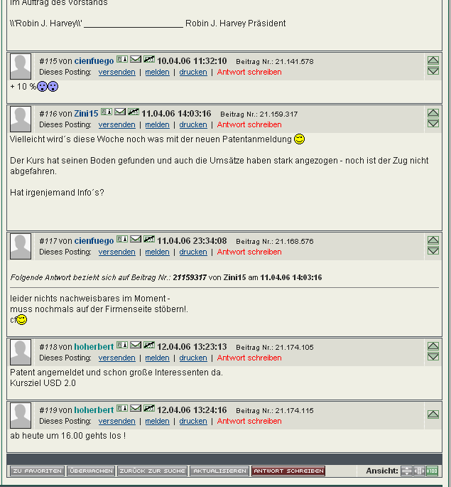 ganau das ist es. Forschen und mit den Ergebnissen daraus ein Geschäft machen. Es ist genau so viel Geld da als nötig. Ich will ja kein Geld kaufen. Das gibt es auf der Bank. Biopetrol war ja auch nichts. Livedoor auch ein Reinfall. Fusa Patriot alles Verlustbringer. das Leben ist ein Spiel und kein Bausparvertrag. Aber mal im Ernst--Psychlogie ist immer dabei, wer das nicht blickt sollte keinen Aktien kaufen. Oder warum bricht Cal Bay ein. das hier die Shorts schon aufgestellt waren haben die, welche erst auf gute Nachrichten anspringen wohl übersehen. Gute Nachrichten sind das Startsignal zum aussteigen. Ruhige Nachrichtenlose Zeiten zum kaufen. Von mir aus mach es umgekehrt denn dein Geld verachte auch nicht. Korrektur von Biopetrol war überfällig.
