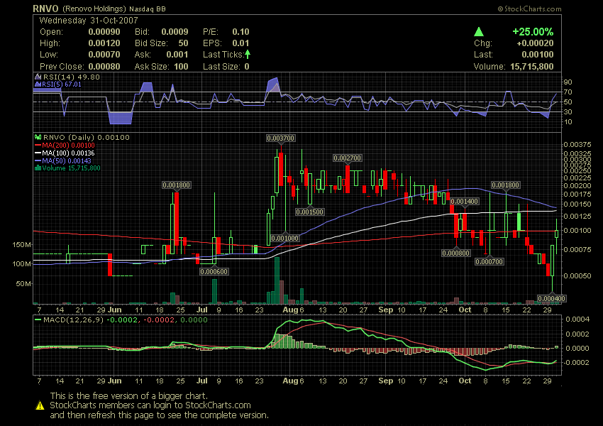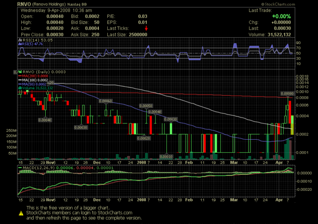The company taking RNVO is Perihelion Global, Inc PHGI .02 (pink sheets) They are up listing (OTCBB) VIA reverse merger with RNVO