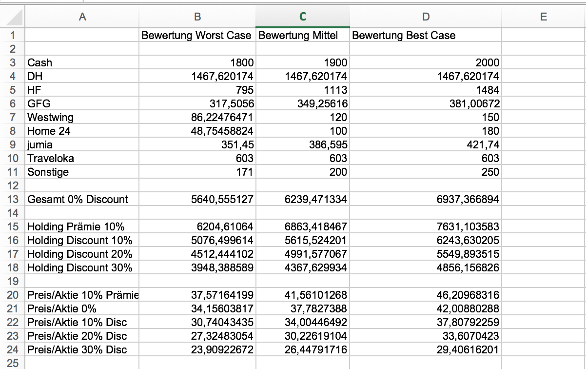 Daher habe ich in meiner Excel Tabelle einfach 3 Spalten gemacht (Worst/Middel/Best Case) und dann jeweils verschiedene Discounts durchgerechnet. Sollte eigentlich selbsterklärend sein. Dann kann jeder schauen, was er für angemessen hält. Mehr als 10% Prämie halte ich jedoch für utopisch.