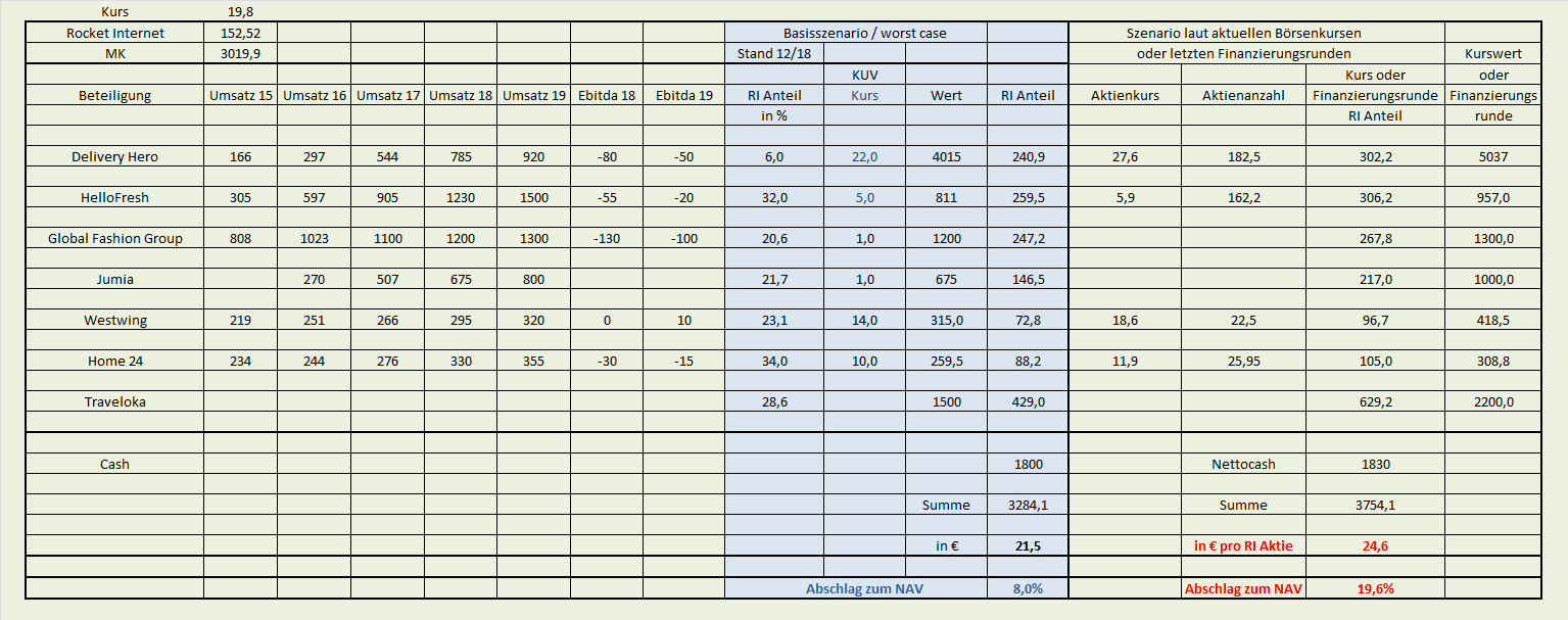 Dennoch, selbst in meinem worst case von nochmal 20% fallenden Kursen der 4 Beteiligungen, sowie 30% niedrigerem Wert der 3 anderen Kernbeteiligungen im Vergleich zur letzten Finanzierungsrunde, läge der NAV aus Kernbeteiligungen und Cash noch 8% oberhalb der MarketCap von Rocket Internet. Hinzu kommen rund 100 weitere Beteiligungen.