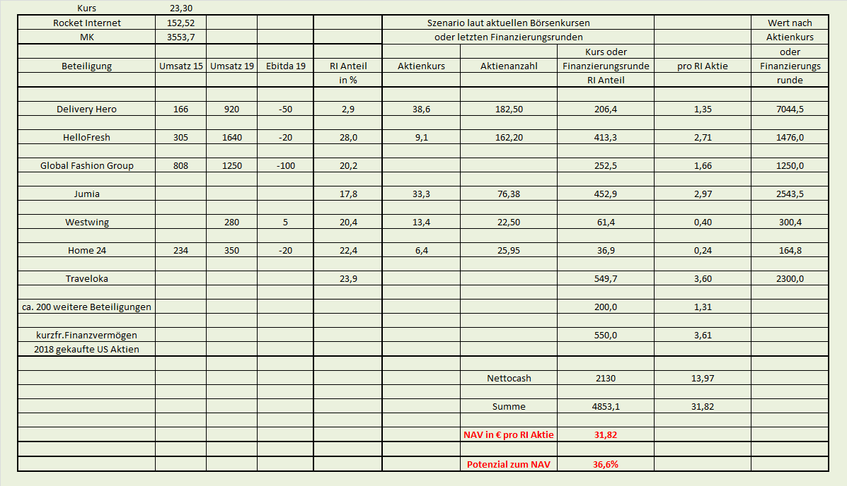 Bei den börsennotierten Unternehmen ist eine Berechnung des RI-Anteils also verhältnismäßig einfach. Interessanter ist natürlich die Frage, wie man GFG und Traveloka bewertet. Bei GFG habe ich den erwarteten 1fachen 2019er Umsatz angesetzt, bei Traveloka gibt es verschiedene Quellen zu letzten Finanzierungsrunden. Ich geh da eher immer konservativ heran, weil man oft so große Pakete nur mit einem Abschlag von 10-15% abstoßen kann. Darauf weißt auch RI immer mal wieder hin. Kann in guten Zeiten aber auch positiver ausfallen.