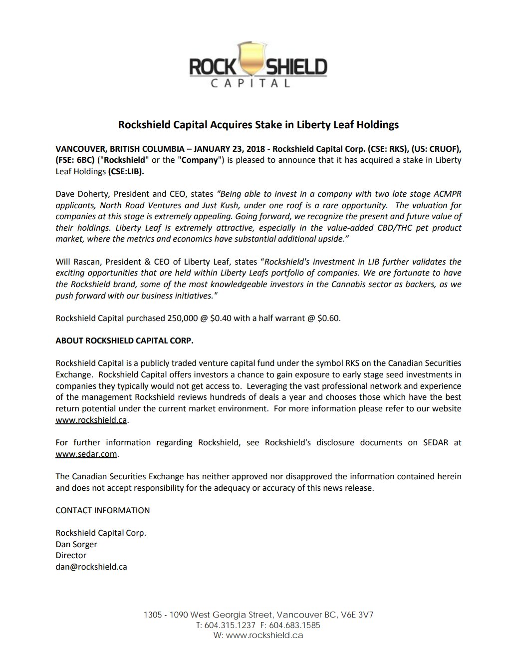 My vision for year one was to fully fund the best in class organic cannabis facility in Canada, which has been accomplished. Adding strategic partners such as Ledcor, Eaton, ALPS and now Aurora dramatically increases our ability to execute on our business plan.