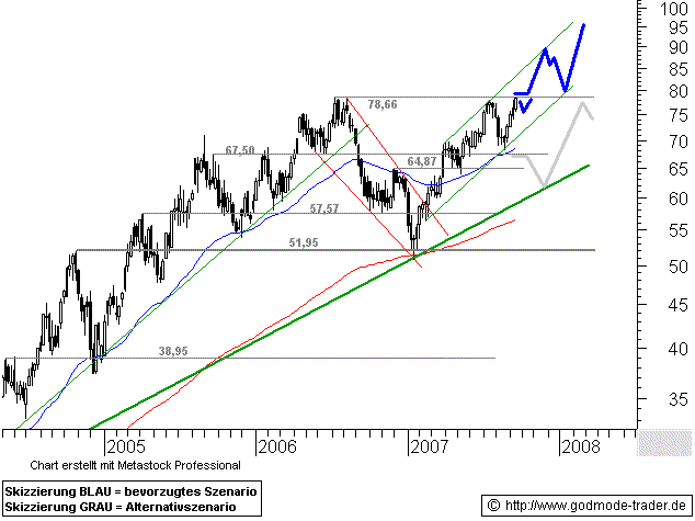 Das Tief wurde am 17.01.2007 bei 50,87 Dollar pro Barrel gehandelt. Anschließend sollten sich steigende Kurse bis 84,61 Dollar entwickeln. Das bisherige Hoch wurde am 17.10.2007 bei 83,13 gehandelt.