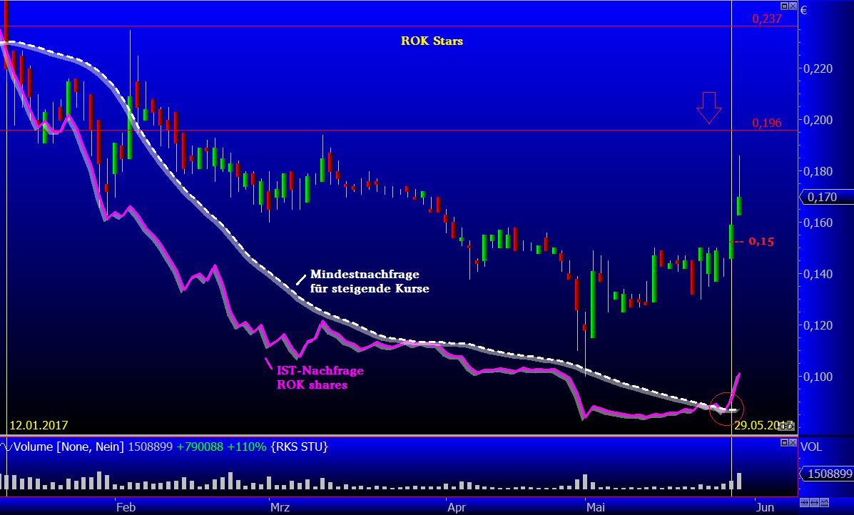 ein Kaufsignal bei ca. 0,15 da es zuvor "berichtet" wurde, was diese Woche alles passieren sollte, stufe ich die Seriosität des "Signals" als eher gering ein, in dem Sinne, dass es mittels wissender Taschen "inszeniert" sein könnte. Nun beginnt das zähe Warten auf Trittbrettbahrer... die an den Kurs anknüpfen. Nächste Widerstände sind ca. 0,19x und 0,23x. ROK typischerweise vermute ich folgendes Szenario: Scheitern am 1. Widerstand (spätestens), bis dahin wird sie intensiv beäugt und wenn es sich tatsächlich so abzeichnen sollte, die Volumenbalken (unten) beachten... ggf. sehen wir dann bereits ein dumpen... um nichts anbrennen zu lassen. Viel Erfolg... wer wie auch immer handelt...