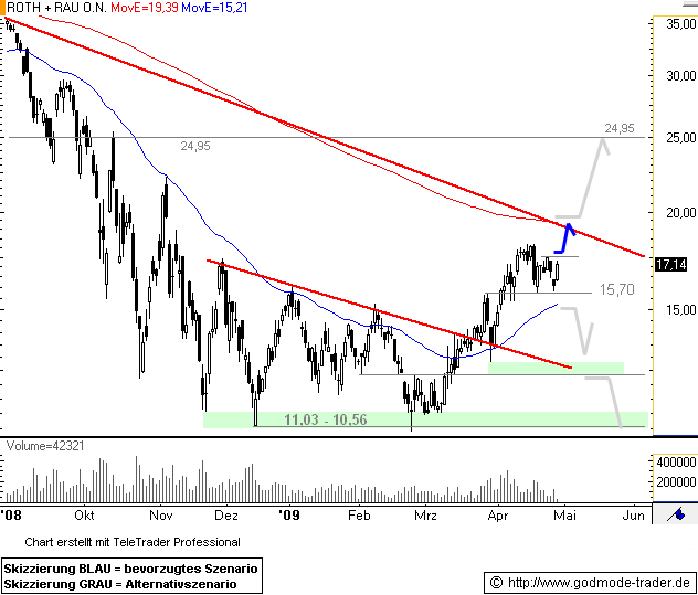 Rückblick: Die Roth + Rau Aktie stabilisierte sich in den letzten Monaten oberhalb des Unterstützungsniveaus zwischen 11,03 Euro und 10,56 Euro und brach schließlich im März über die deckelnde Abwärtstrendlinie aus. Die Folge war eine steile Kursrallye bis auf 18,19 Euro, welche in den vergangenen Tagen auf hohem Niveau korrigiert wurde.