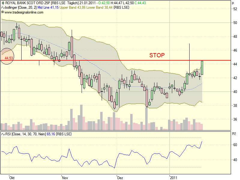 Die RBS soll vorraussichtlich bis Ende des Jahres oder im laufe des jahres 2012 aus der Verstaatlichung raus sein, schaut euch mal den Kurs in London heute morgen an der ist London stock exchange an, da ist jetzt richtig druck von 42 p sofort auf die 43,50 p gesprungen...ich bleib weiterhin on, kurse von 0,60 cent in deutschland nicht ausgeschlossen in nächster Zeit, zumal auch die Nachrichtenlage sehr gut ist und alles auf ein Anstieg hindeutet, sogar die Arbeitslosenzahlen sind in Großbritanien in den letzten 3 monaten stark zurückgegangen, und haben die erwartungen übertroffen.