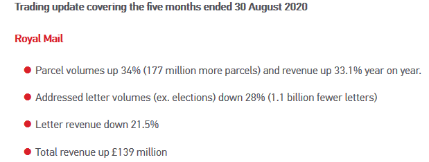 ...the mix shift from handling more parcels and fewer letters increased costs in the period by £85 million. In addition, costs related to COVID-19 ... were £75 million in the first five months.
