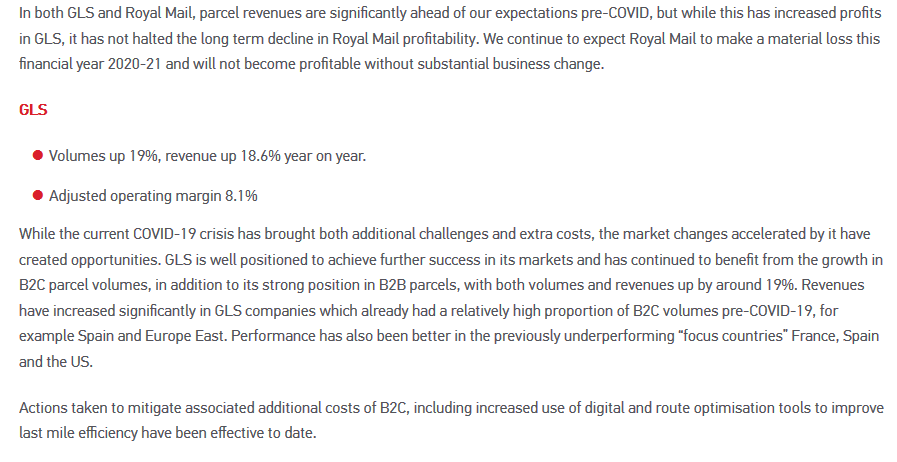 Wirtschaftlich geht es für RM leider noch nicht in allen Bereichen in die richtige Richtung, denn obwohl GLS und Royal Mail ihre Parketumsätze und GLS seine Überschüsse deutlich ggü. den Vor-COVID-Prognosen steigern konnten, hat es bisher nicht den langfristigen Abwärtstrend der Royal Mail Profitabilität brechen können.