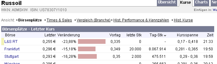 Die Papiere gehörten zuletzt teilweise zu den Umsatzspitzenreitern an der Frankfurter Präsenzbörse. Von Russoil wurden zum Beispiel 50 bis 70 Millionen Stück täglich gehandelt.