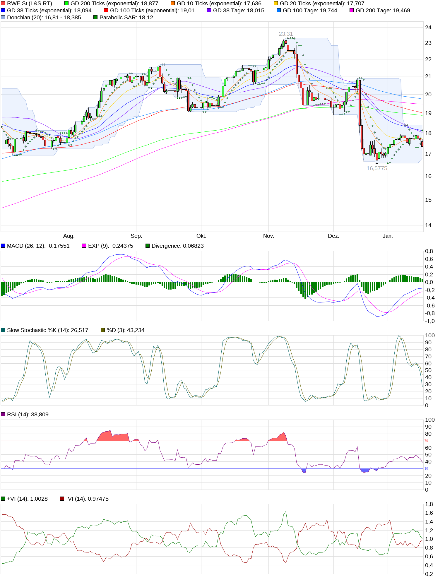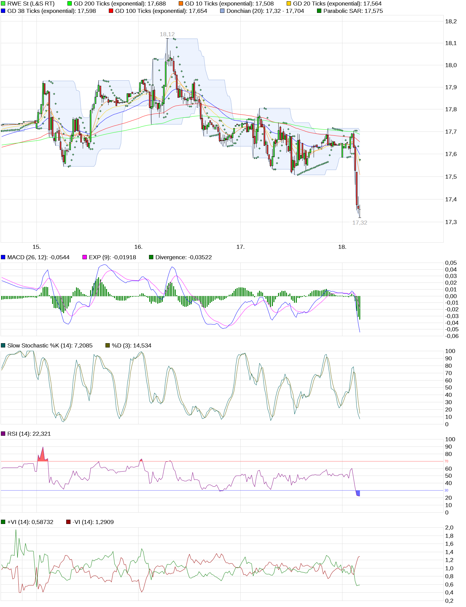 Ich rechne mit einem Durchsacker bis zu 17 € und danach geht es ab nach Norden in Richtung 18,12 €. Dieser Wert ist zur Zeit für mich der wichtigste, und er wird von dem Parabolic SAR markiert, welcher auf dem Chart als grüner Punkt markiert wird.