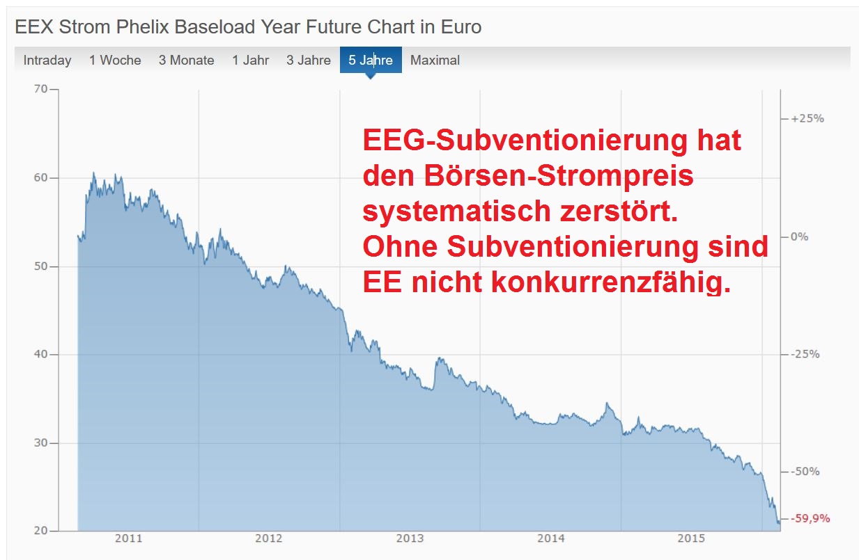 Nämlich die EEG-Umlage, die ja die Einspeisvergütung subventioniert. Aber die Berechnung der EEG-Umlage erfolgt durch die Differenz zwischen Börsenstrompreis und EEG-Vergütung. Also ergibt das ein Paradoxon in der Form, dass je billiger der Börsenstrom (durch Wind und Solar) wird, desto teurer wird die EEG-Umlage.