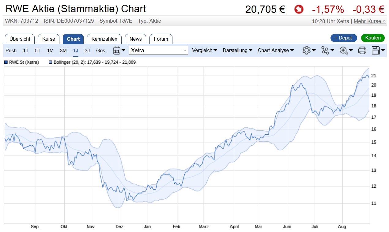 Ist RWE meiner Meinung nach schon fair bewertet. Ich werde trotzdem erstmal dabei bleiben und es weiterlaufen lassen. Die 25,00 halte ich schon noch für möglich, zumal die Dividende von 1,50 noch den einen oder anderen hinein locken wird.
