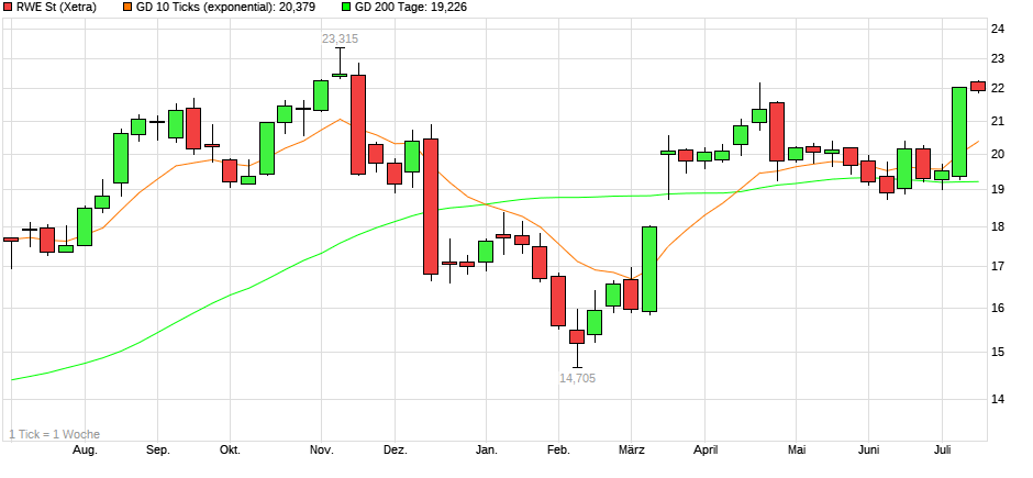 trotzdem ist RWE eine gute Aktie zum halten, weil man inzwischen relativ sicher sein kann, dass RWE jederzeit dieses Niveau wieder erklimmen kann. langfristig gesehen ist RWE aktuell günstig bewertet, gerade deshalb eignet sich RWE auch gut zum halten.