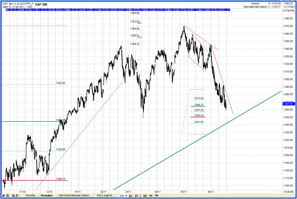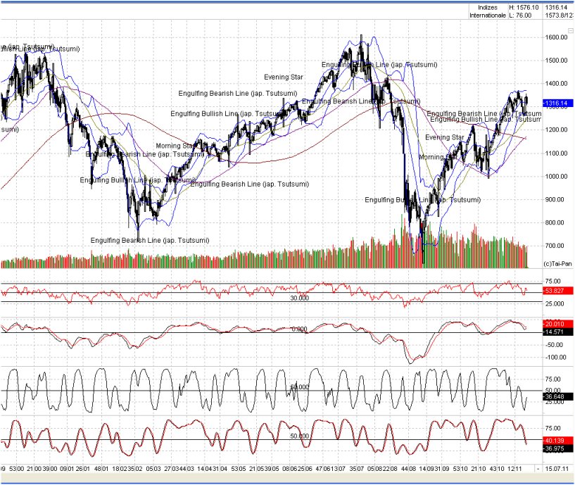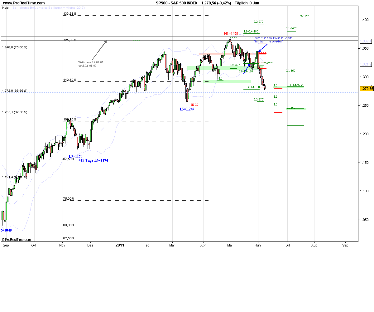 zunächst zu dem Chart von tradesignal. Am 10.03.2011 wurde die 1*1 Angle (deutsch: Winkellinie) mit Steigung 20 Punkte pro Tag, gebrochen (aufwärtsführende, hellrot markiert). Nach Gann Regeln wird früher oder später die nächste nach unten erreicht, dies währe die 1*2 Angle. Also wichtig für weiteres Verlauf ist, dass 1*2 nach unten nicht bricht, sonst ist die nächste Angle dran. Darüberhinaus wurde in diesem Bereich am 16.03.2011 und am 01.03.2008 Tief gemacht. Bruch von diesem würde bedeuten, dass langfristiger Trend nach unten dreht.