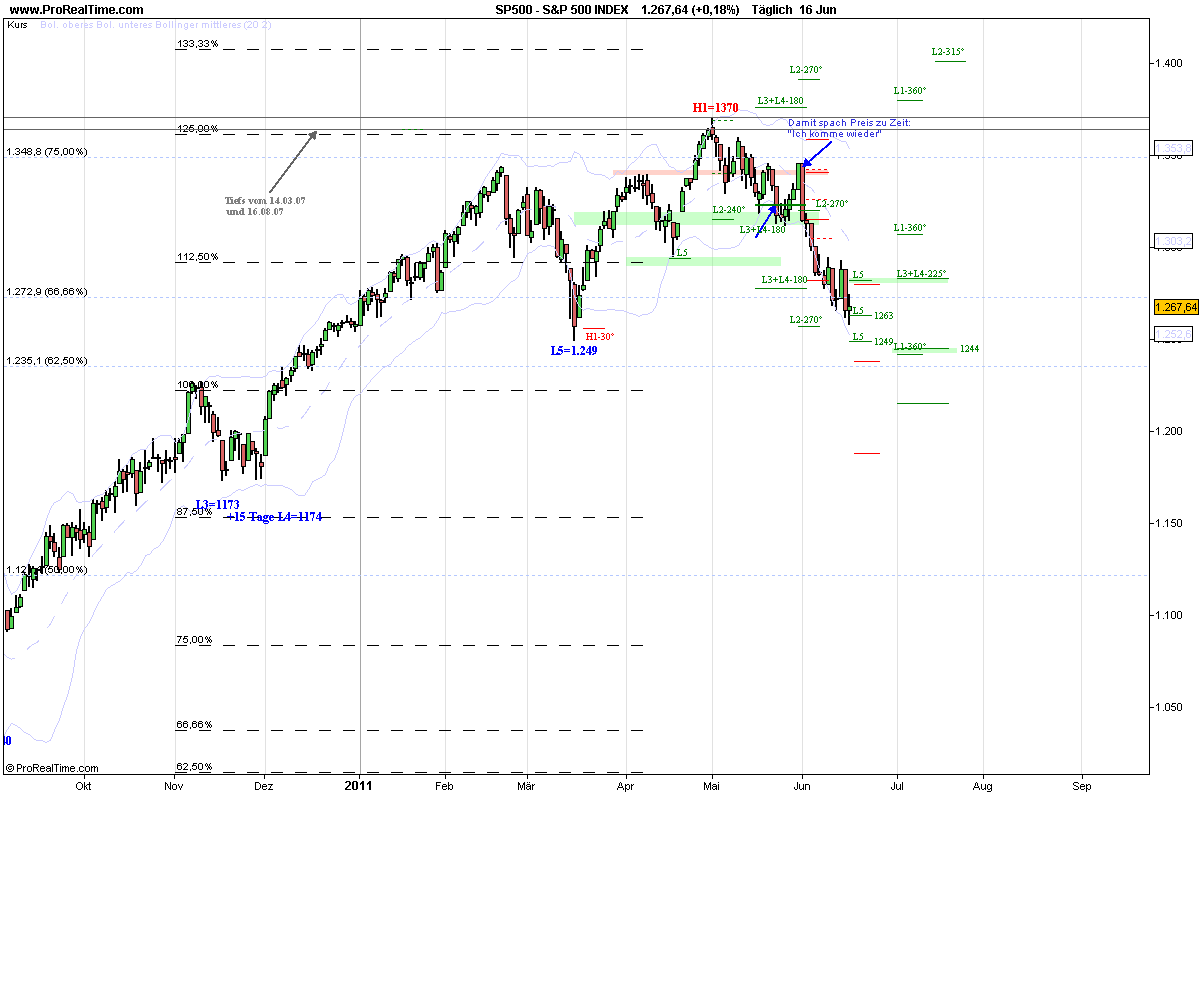 Letzter Zeitwiderstand war, bzw. ist – 31.05 bis 02.06 (so genommen sind  wir immer noch in diesem Zeitraum wo noch was passieren kann). Nächster  liegt bei 16-17.06 (+-1bis 2 Tage). Die Preismarken/Winkellinien in  diesem Zeitraum liegen bei 1280-1282; 1262; 1249; 1238. 1249 ist auch  gleichzeitig Tief L5.