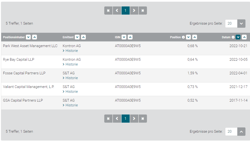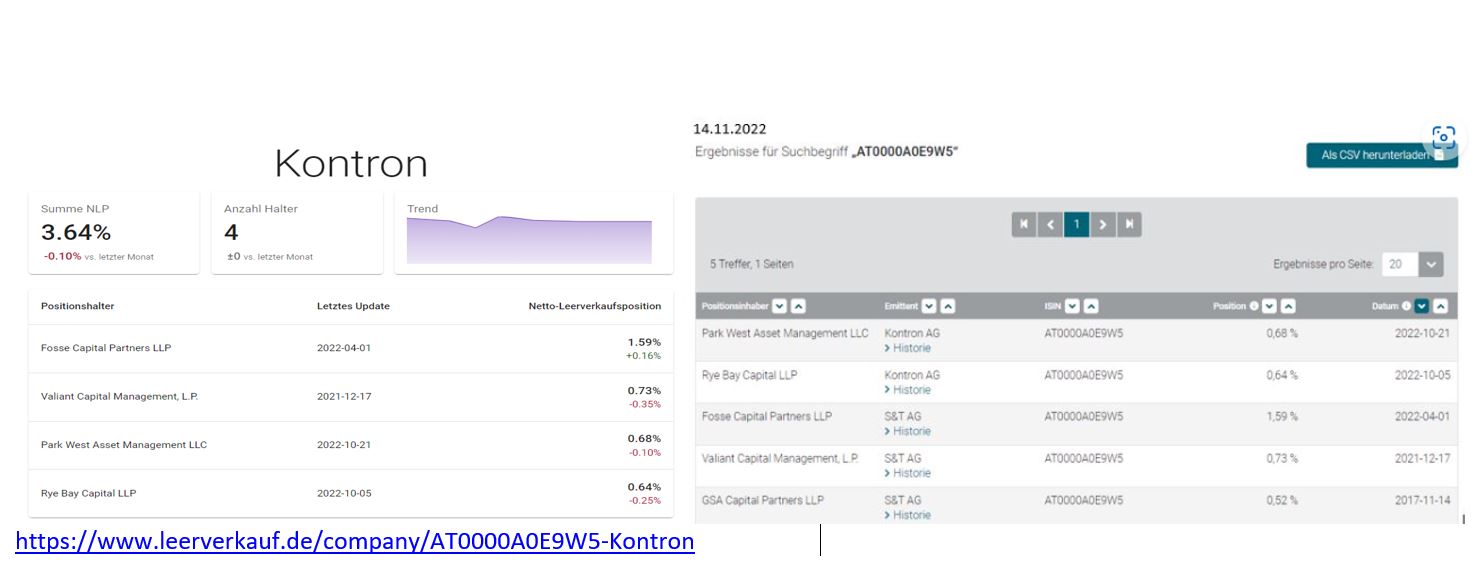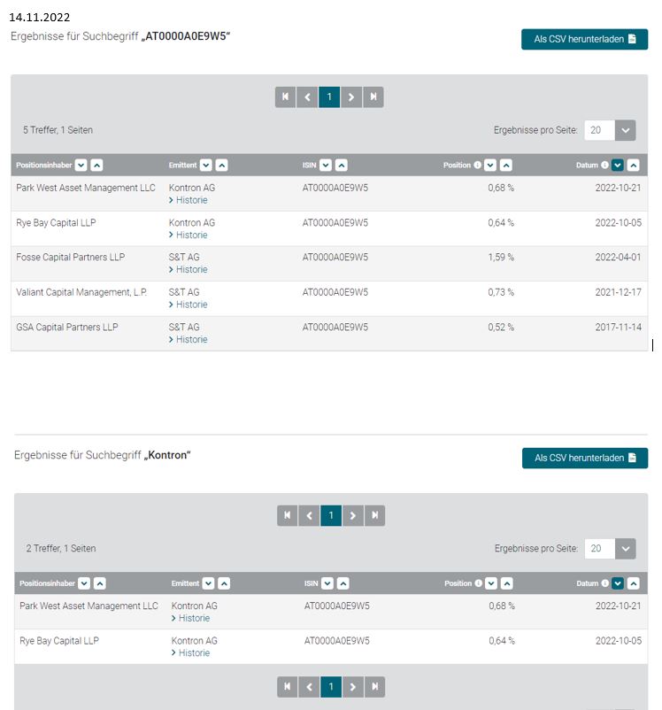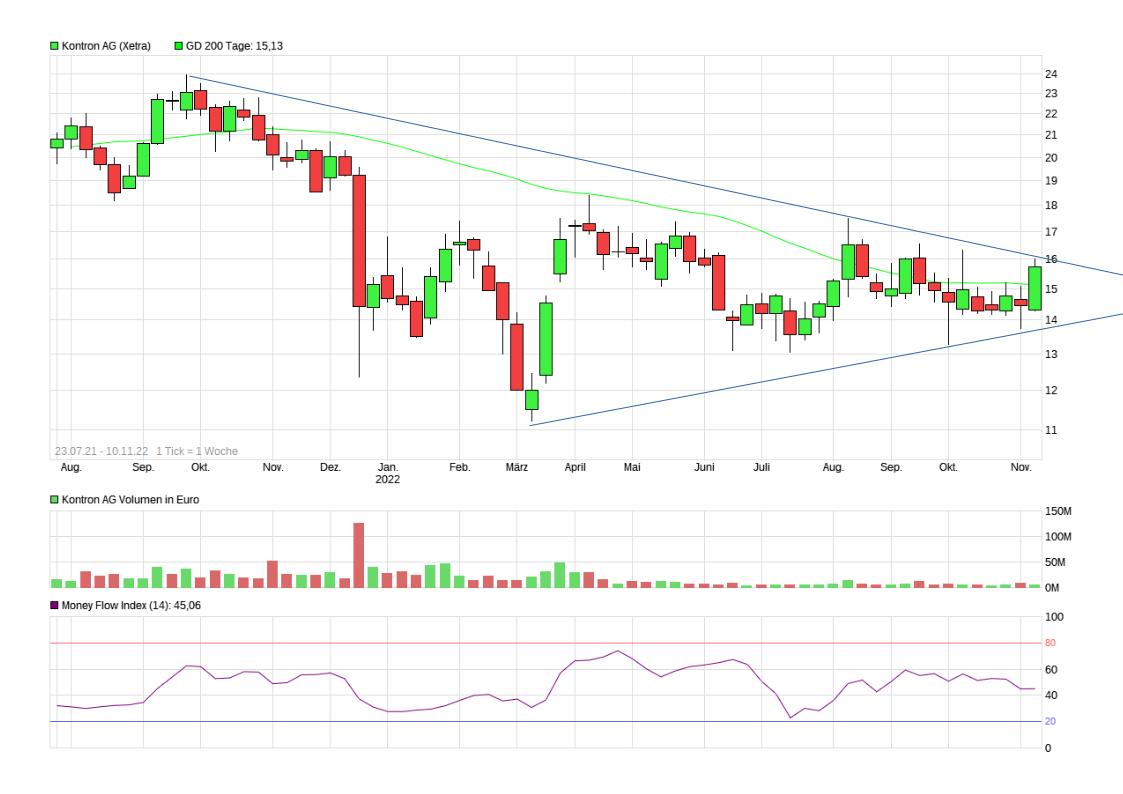 grosso tec kauft noch mehr Kontron-Aktien 07.11.2022, - www.boerse-social.com/2022/11/07/...och_mehr_kontron-aktien_1 "...Weitere Aktienkäufe bei Kontron: Die grosso tec hat den Kauf von weiteren 3.033 Kontron-Aktien zu einem durchschnittlichen Preis von 14,2 Euro pro Aktie gemeldet. Der Kauf erfolgte laut Veröffentlichung am 4. November. Kontron-CEO Hannes Niederhauser ist ein Hauptgesellschafter der grosso tec, die die vergangenen Wochen immer wieder Aktienkäufe getätigt hat..."