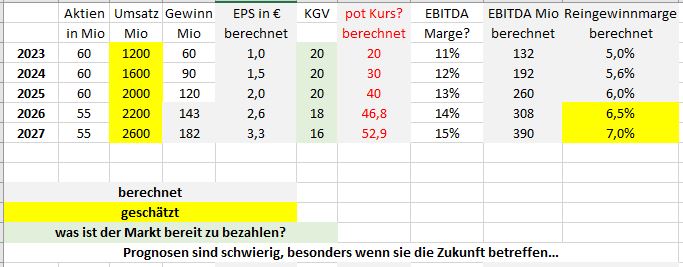 Eigentlich müsste man die längerfristige Zukunft bewertung und diskontieren. Ich persönlich gehe ja davon aus, dass Kontron über mehrere Jahre zweistellig wächst und die EBITDA-Marge langfristig auf 15% steigern kann. In dem Video habe ich ausgeführt was unter unterschiedlichen Annahmen in einem DCF-Modell herauskommt und was davon die Analysten eingepreist haben. Wenn die Pläne 2025 aufgehen und die Analyten in 2025 eine positive Zukunft fortschreiben, dann werden die Kursziele wahrscheinlich über 50€ liegen. Das KGV-Multiple kommt dann zum Tragen wenn die Analysten in Zukunft weiterhin für die Zukunft nur verhalten optimistisch sind.