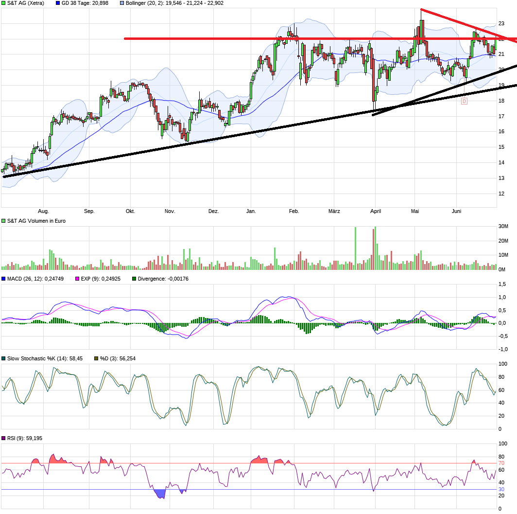 in den Kurs. Den seit Anfang Mai fallenden Abw.trend geknackt und gleich auch noch den Widerstand bei 22,66 rausgenommen. Nimmt man Fahrt auf, um die 23,80 auch mal anzukitzeln? Gab keine News bislang zu lesen die den starken Kursanstieg erklären könnte. Sind da viele Leute vielleicht zuletzt am Seitenrand in stiller Bereitschaft gewesen, um nur auf einen Break der Abw.trendlinie zu warten bevor man kauft oder gab es vielleicht irgendwo wieder eine Musterdepotaufnahme eines größeren Lemmingscheuchers ( Kulmbach & Co?). Gibt es Leerverkäufer die sich eindecken? Kauft ein größerer Vermögensverwalter zu? Fragen gäbe es viele, Antworten stehen aus. Erstmal zumindest gut, daß es diesen Break nach oben gab.