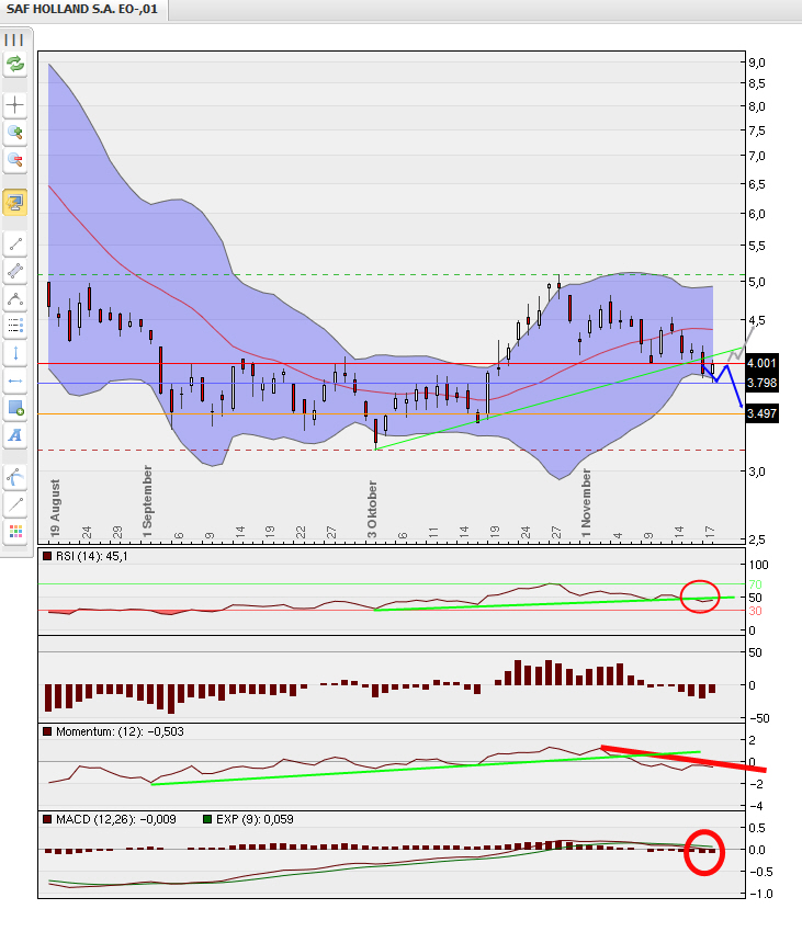 Unterhalb von 4,40 Euro besteht auf Tagesschlussstandbasis (14.11.) jedoch das Risiko einer andauernden Kursabwertung. Unterschreitet die Aktie dabei die Marke von 4,00 Euro, wären erneute Verluste bis zum Mehrjahrestief von 3,17 Euro wohl kaum mehr zu vermeiden .... ist es jetzt bereits soweit?