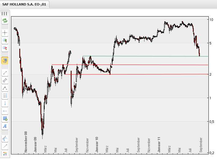 Hält die Marke von 3,40 kann man einen (Nach-)Kauf riskieren. Fällt diese Marke jedoch nachhaltig, dann sind charttechnische Unterstützungen leider dünn gesäht (eventuell 2,60 dann 2,00). Man merkt, dass 3,40 sehr wichtig ist - dieser Bereich wird immerhin seit 2 Stunden halbwegs verteidigt. Wenn ich schon drin wäre, würde ich nicht unbedingt verkaufen, aber das muß jeder selbst entscheiden ..