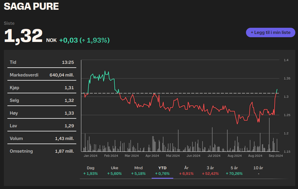Dennoch kann man irgendwie keinem Kleinanleger raten sich am Spiel der Großen hier unmittelbar zu beteiligen. Insgesamt investieren aussenstehende Investoren nun 186 Millionen NOK in den Betrieb. Ein Drittel könnte durch Spetalens Gesellschaften kommen. Davon vielleicht ein Drittel durch seine Gesellschaft Saga Pure ASA. Also etwa 20 Millionen NOK? Bei einem sehr spekulativen 20-Bagger unter optimalen Verhältnissen wäre das ein Kursanstieg von etwa 1 NOK im Saga Pure Kurs.