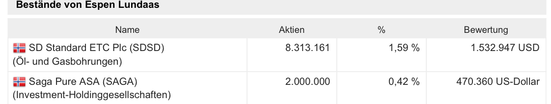 Anteile an Firmen: Die übrigen 0,5 NOK Anteilswert fallen auf die Spekulationen von Saga. Das ist momentan sehr wenig. Wirklich schade. Melcher und Simonsen sind von ihren eigenen Einstandswerten nicht weit entfernt.