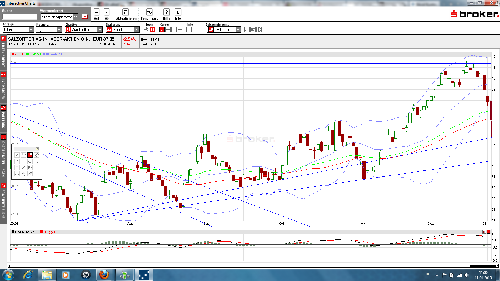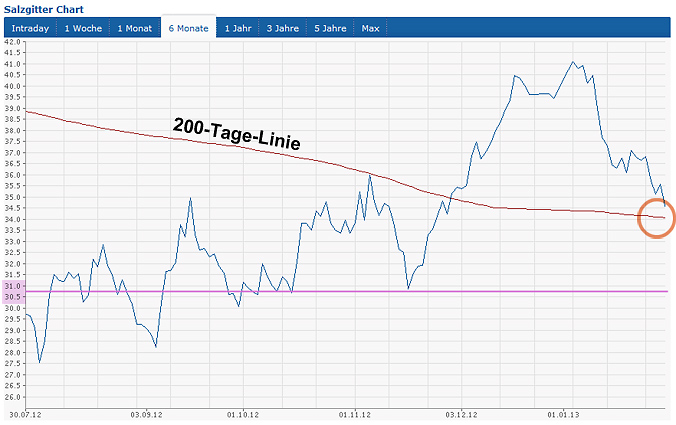Ich bin noch nicht investiert und erwarte beim DAX fallende Kurse (siehe mein DAXIndikator), aber ich bin mir nicht sicher, ob Salzgitter tatsächlich mit runter geht oder ob Salzgitter oben bleibt.
