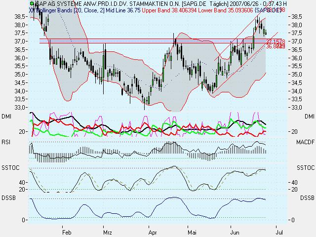 Im Vergleich mit dem DAX wird die extreme relative Schwäche der Aktie zum Gesamtmarkt deutlich. Während der DAX sein Hoch vom Frühjahr 2006 bereits weit übertroffen hat, markierte SAP ein neues Tief in diesem Zeitraum.
