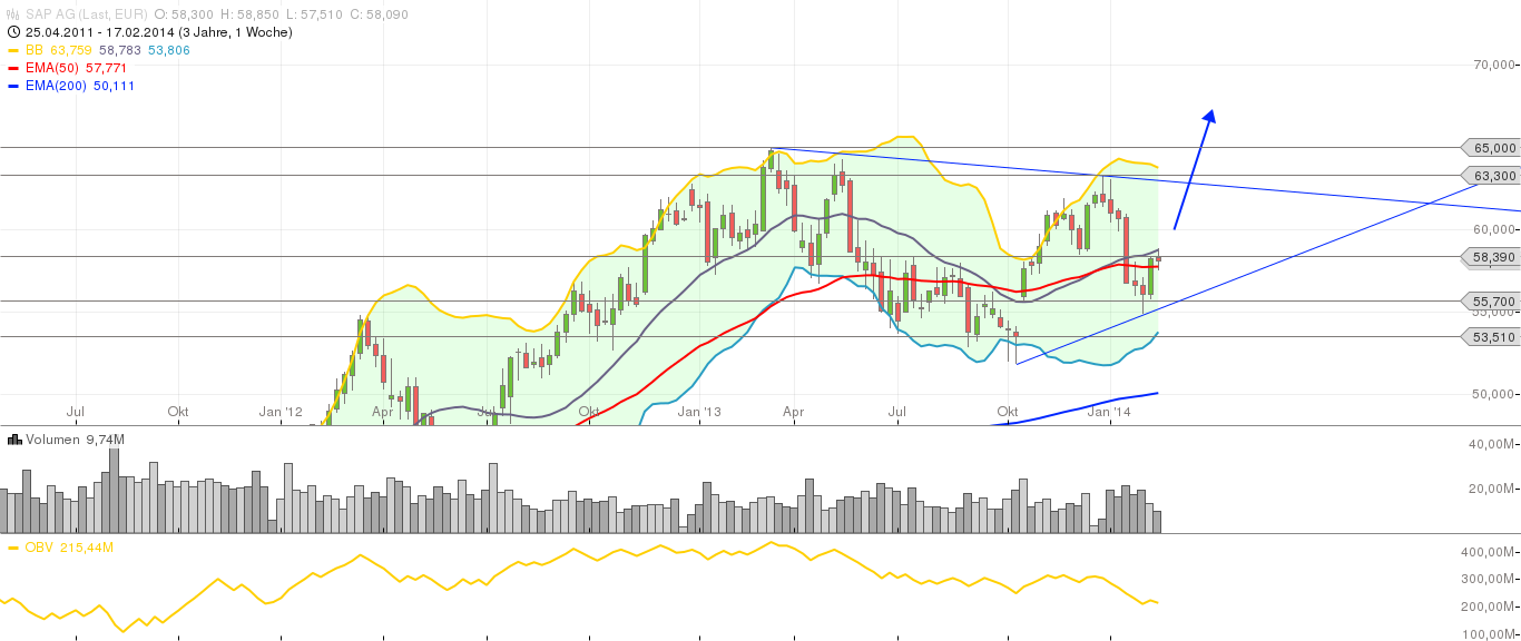 Im Moment befinden wir uns in einem Dreieck (wie übrigens viele Daxwerte), nächste interessante Marke wäre ungefähr bei 63,30€. Sollte ein Ausbruch gelingen sind höhere Kurse durchaus möglich. Zeithorizont: 2-3 Wochen. Es sei denn aus irgendeinem Grund wird hier vorher schon ne Rakete gezündet.