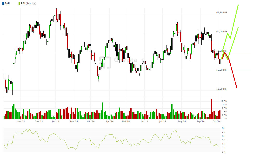 Da Oracle und Salesforce ja schon ordentlich vorgelegt haben hinkt SAP nunmal ziemlich stark hinterher. Dax eröffnet Montag morgen bei ca. 9350/9370 und SAP erstellt ein UP Gap und startet bei 57,50 und mehr. Sie übergeht die 57,50 Hürde sofofrt und steigt bis Ende der Woche auf 60, holt die Woche darauf nochmal Luft bis 58,50/59 um nach den Zahlen den Weg Richtung 65 zu suchen. (Bis Mitte November)